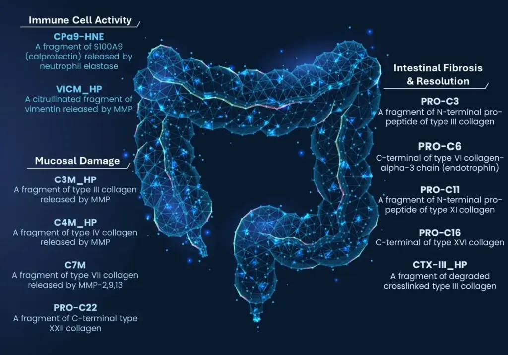 In our recently published paper “Circulating Extracellular Matrix Products as Indicators of Disease Burden and Predictors of Disease Course in Ulcerative Colitis”, we identified C7M (MMP-9/13-degraded type VII collagen α1-chain), nordicPRO-C3™ (type III collagen formation), and PRO-C22 (turnover of type XXII collagen) as biomarkers of endoscopic disease severity and treatment response in UC.