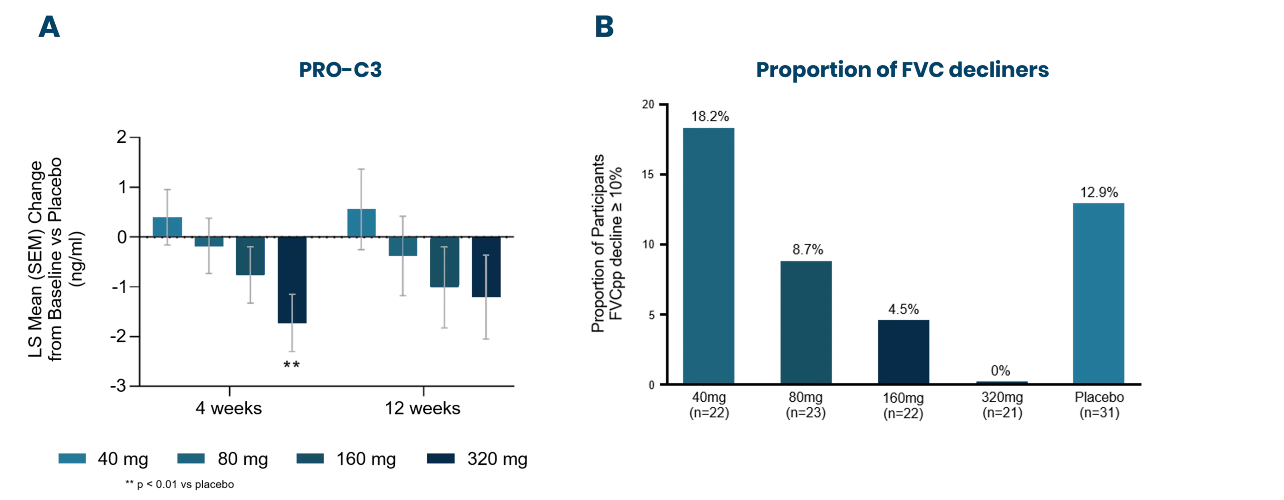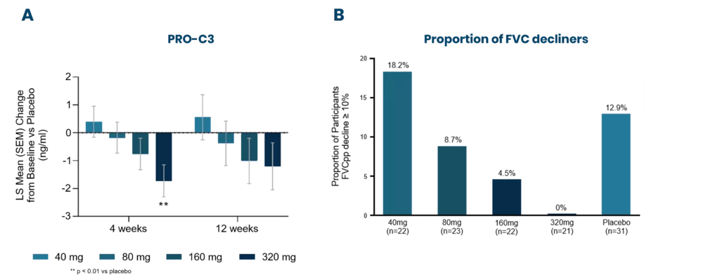 Figure 3: The INTEGRIS-IPF phase 2a clinical trial evaluated the effects of a dual integrin inhibitor in 119 IPF patients. Patients received placebo, 40 mg, 80 mg, 160 mg, or 320 mg of Bexotegrast (PLN-74809). The study met its primary endpoint, and the figure shows the 12-week interim data. A) Change from baseline in serum nnordicPRO-C3™ (PRO-C3) levels vs Placebo at 4 and 12 weeks. B) Proportion of participants having a decline in FVC in percent predicted (FVCpp) ≥ 10% at week 12. LS: Least Squares, SEM: Standard Error of the Mean
