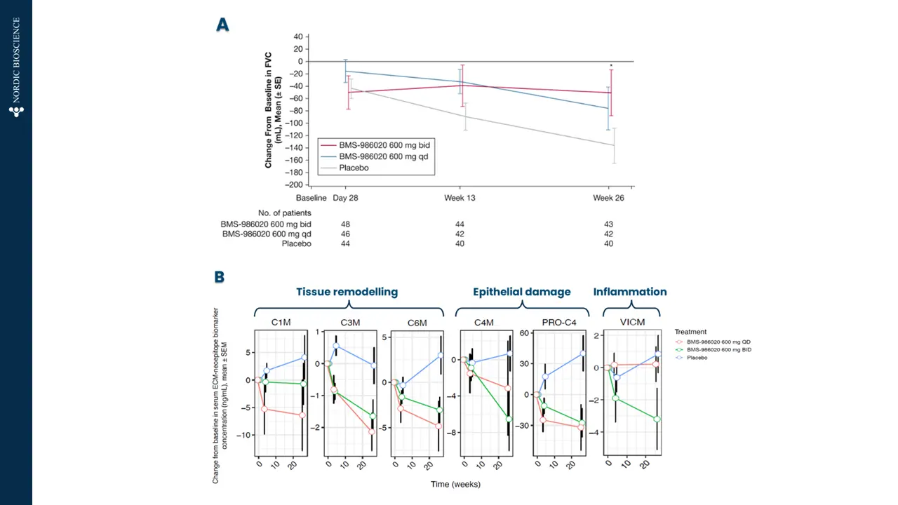 Nordic Bioscience’s biomarkers are pharmacodynamic and can serve as indicators of treatment effect. In particular, the LPA1 antagonist BMS-986020 significantly improved FVC decline in a phase 2b clinical trial of IPF (figure 2A)[3] and reduced the levels of biomarkers reflecting tissue remodeling, epithelial damage, and inflammation (figure 2B)[4].