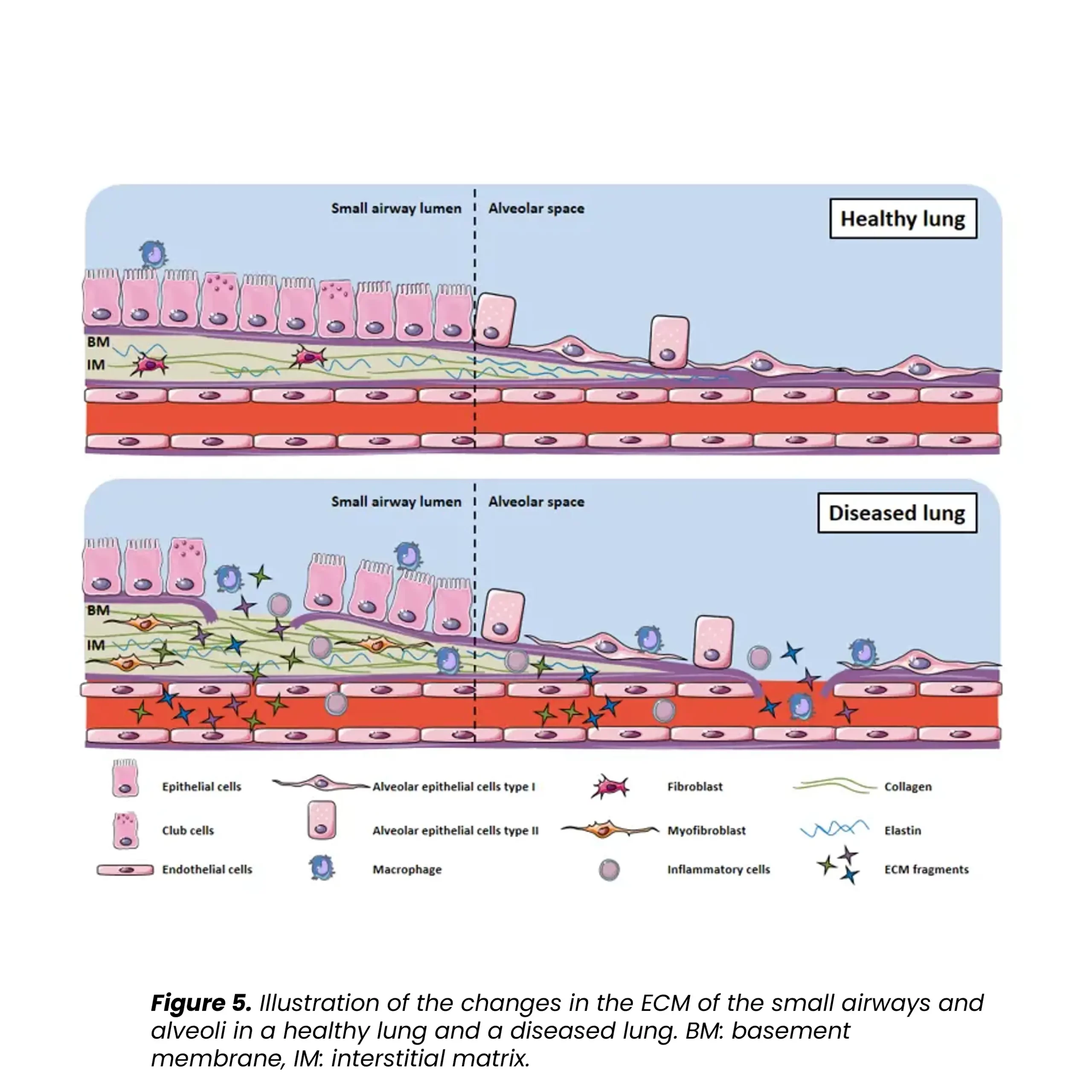 Pulmonary fibrosis is characterized by a dysregulated ECM remodeling. In particular, IPF is believed to be initiated by injury to the alveolar epithelial layer, disrupting the underlying basement membrane. Ineffective attempts to repair the epithelium and basement membrane activates fibroblasts which start to secrete ECM proteins which are then deposited in the interstitial matrix. The normally thin layer of tissue in the distal lungs is thickened, hindering gas transfer in the alveoli. The fibrillar type I and III collagens are the main ECM proteins deposited in the fibrotic tissue.