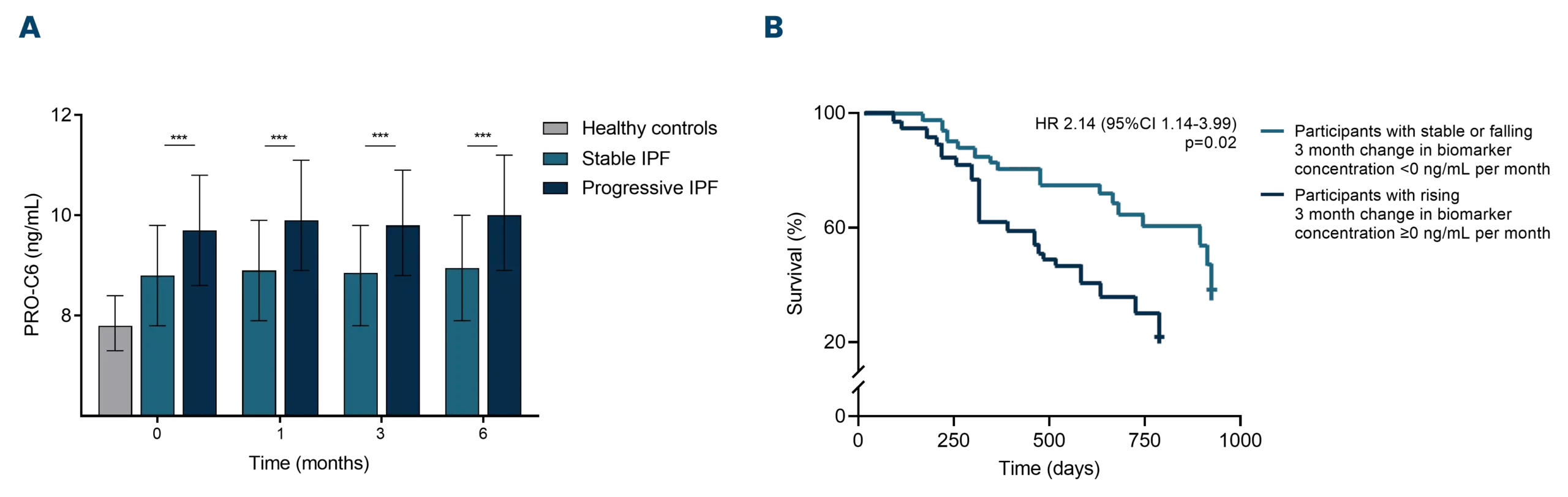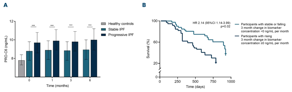 Moreover, IPF patients with high baseline biomarker levels were at increased risk of mortality. Additionally, it has been shown that IPF subjects with increasing biomarker levels over three months were at greater risk of mortality compared to those with stable biomarker levels (figure 1B)[2].
