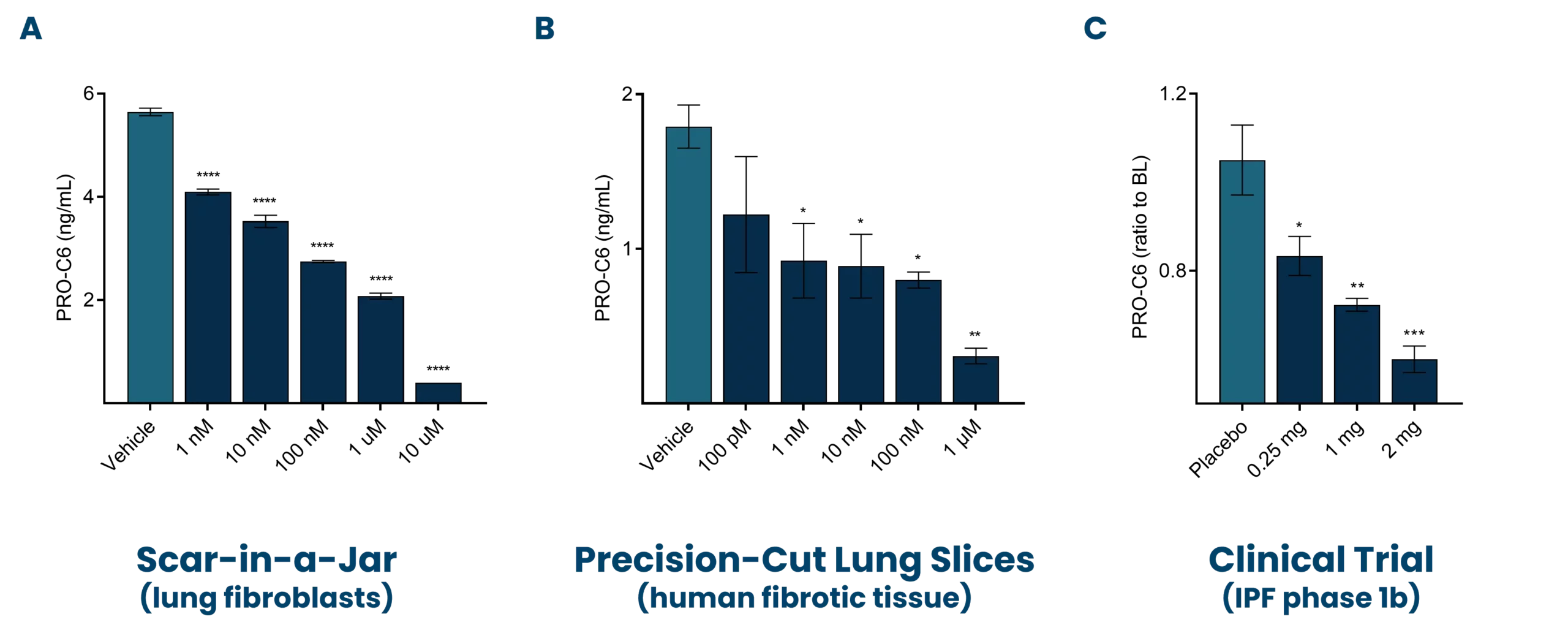 Figure 4. Nordic Bioscience’s biomarker PRO-C6 was dose-dependently modulated by anti-fibrotic treatment across the model systems A) Scar-in-a-Jar (SiaJ) and B) precision-cut lung slices (PCLS), as well as C) in patients with idiopathic pulmonary fibrosis (IPF). BL: Baseline.