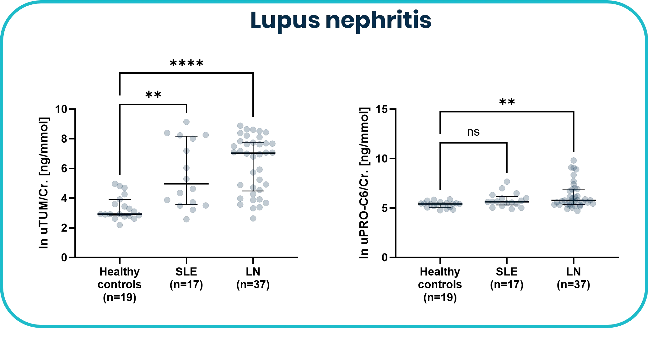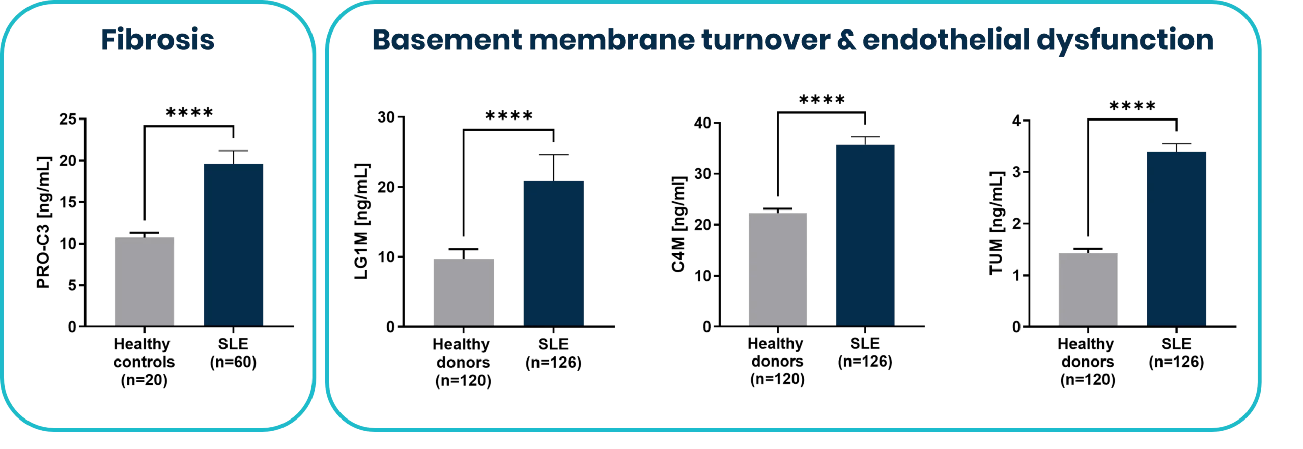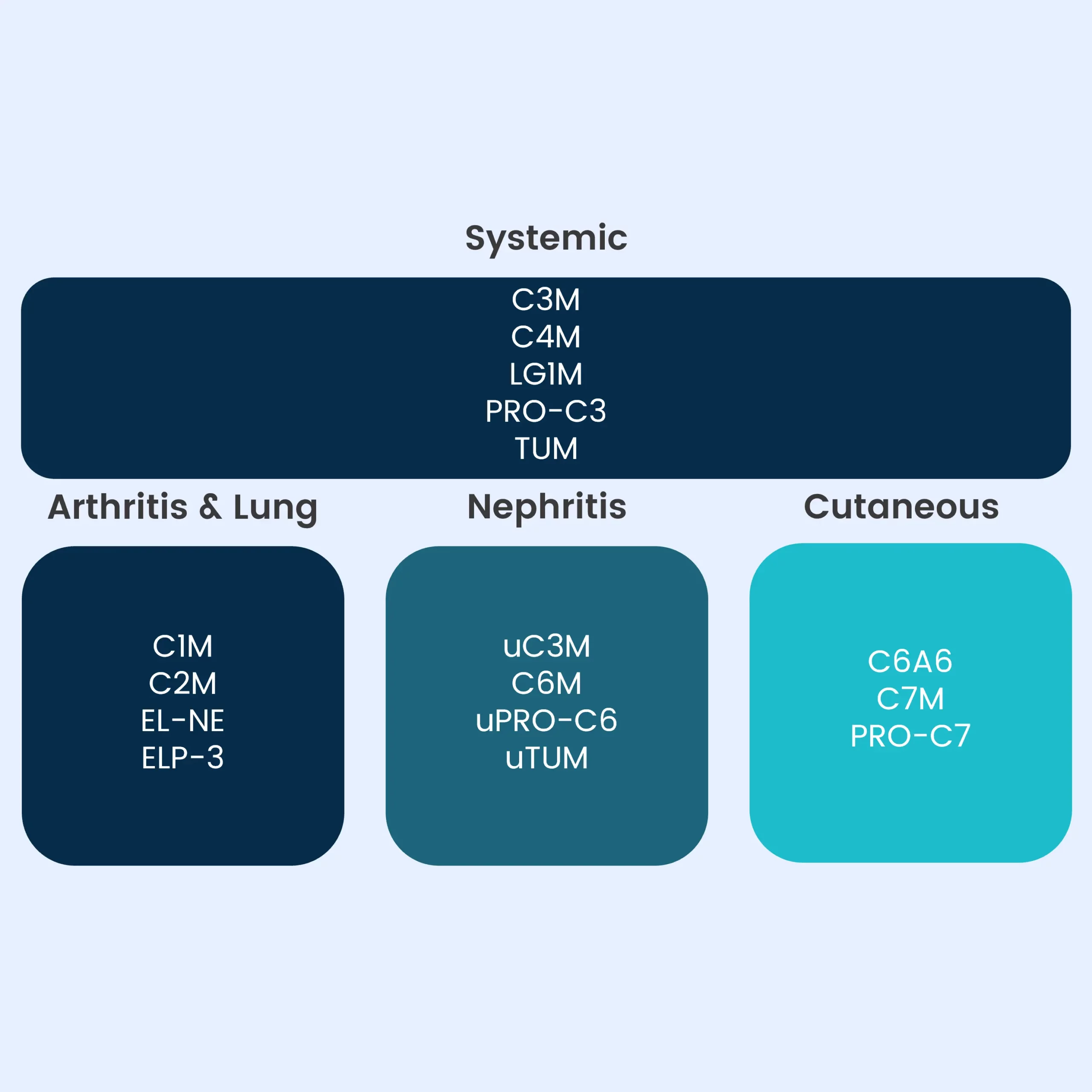 In lupus nephritis (LN), specific ECM biomarkers can provide insights into renal tissue remodeling and disease progression. NordicPRO-C6™ reflects the formation of type VI collagen, which is particularly enriched in the renal interstitium. Elevated levels of nordicPRO-C6™ suggest ongoing interstitial fibrogenesis, a key process associated with chronic kidney damage and a predictor of progression in LN.TUM is relevant in LN due to its association with basement membrane remodeling and its potential link to glomerular injury and vascular dysfunction. Together, these markers can help identify active fibrotic and vascular processes in the kidney, supporting their use in monitoring LN disease activity and progression.